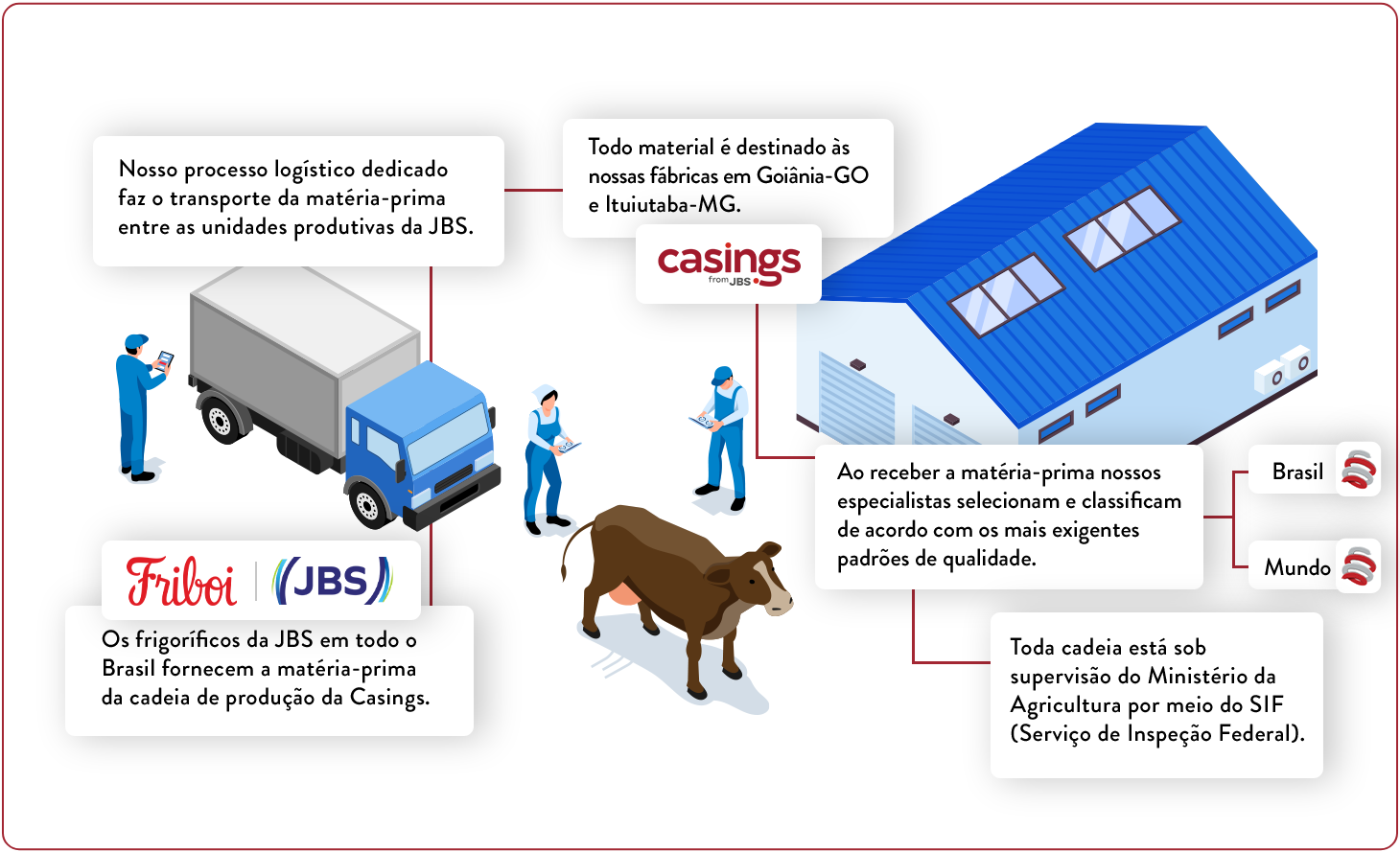 A JBS Novos Negócios gerencia os resíduos provenientes da cadeia de produção da JBS e os transforma em produtos de alto valor agregado, como o envoltório natural bovino.